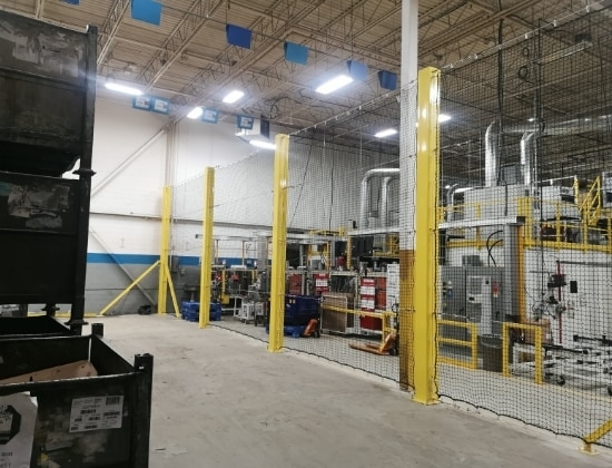 Factory Supply installed a mezzanine safety net system to prevent worker falls while allowing safe access to overhead equipment, combining protection with flexible, durable net panels.