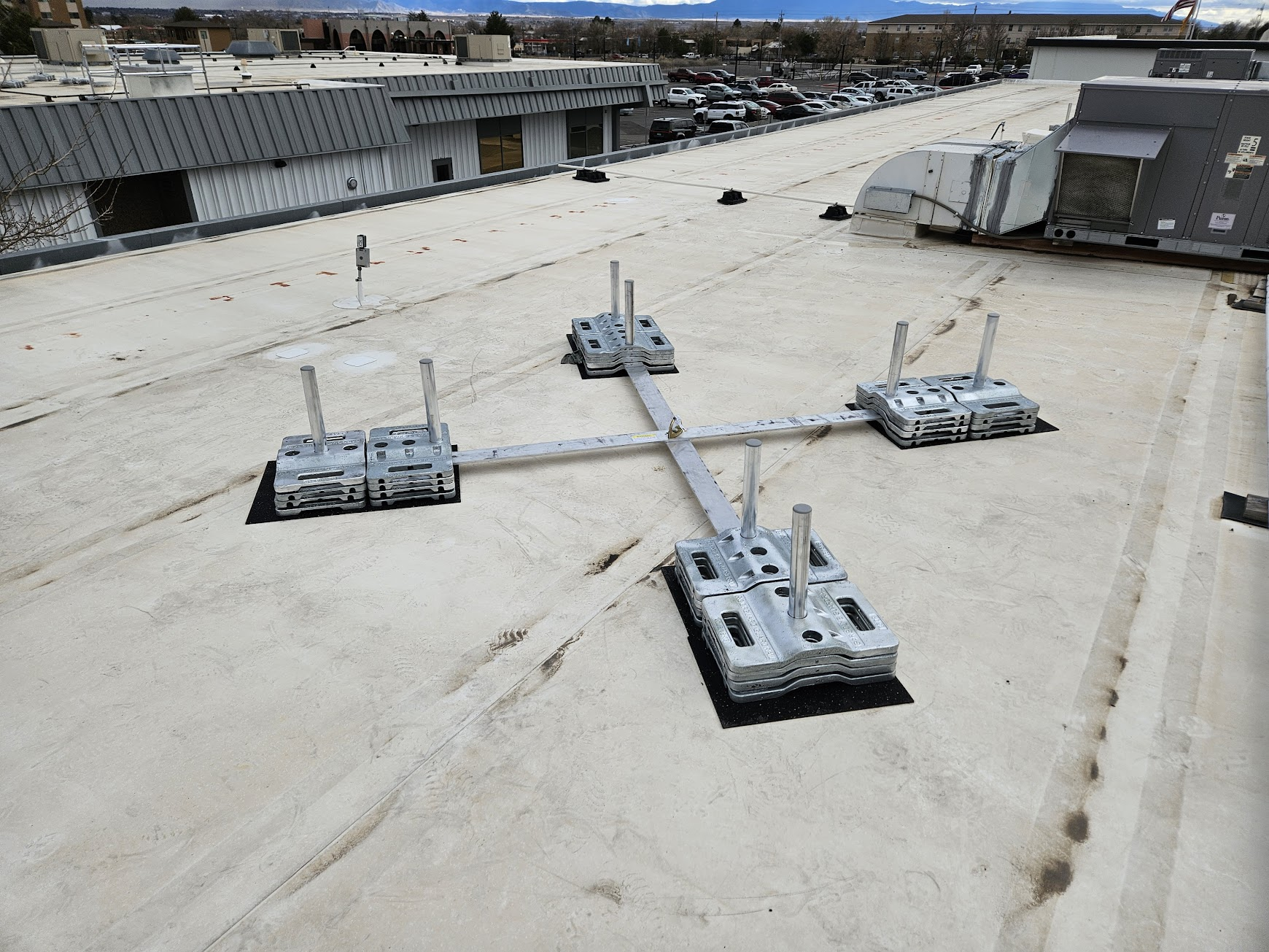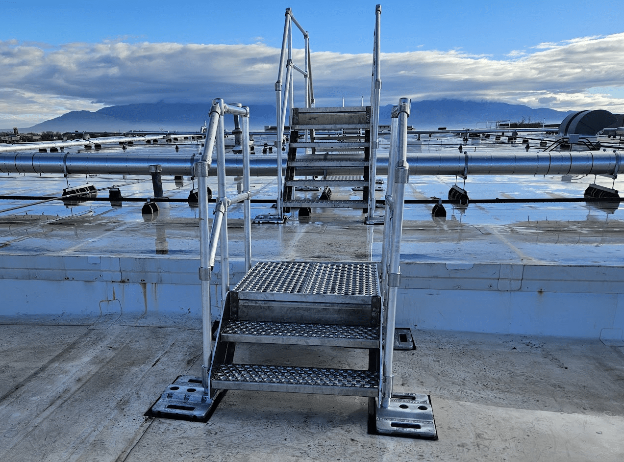 A custom ballasted stair and crossover stair were installed for safe access and fall protection, meeting OSHA and ANSI standards. The modular, lightweight system protects the roof membrane and installs quickly without welding, saving time and costs.
