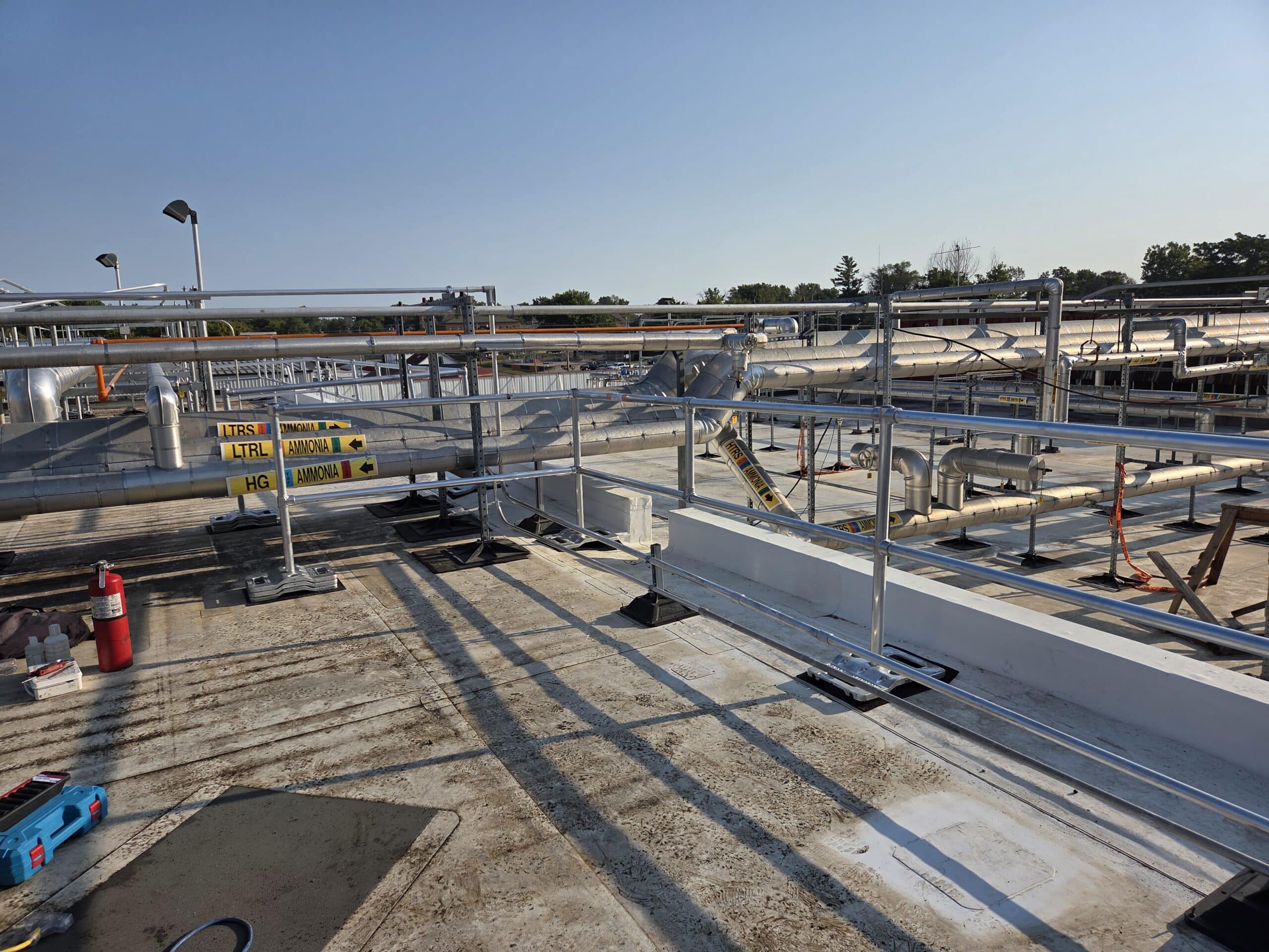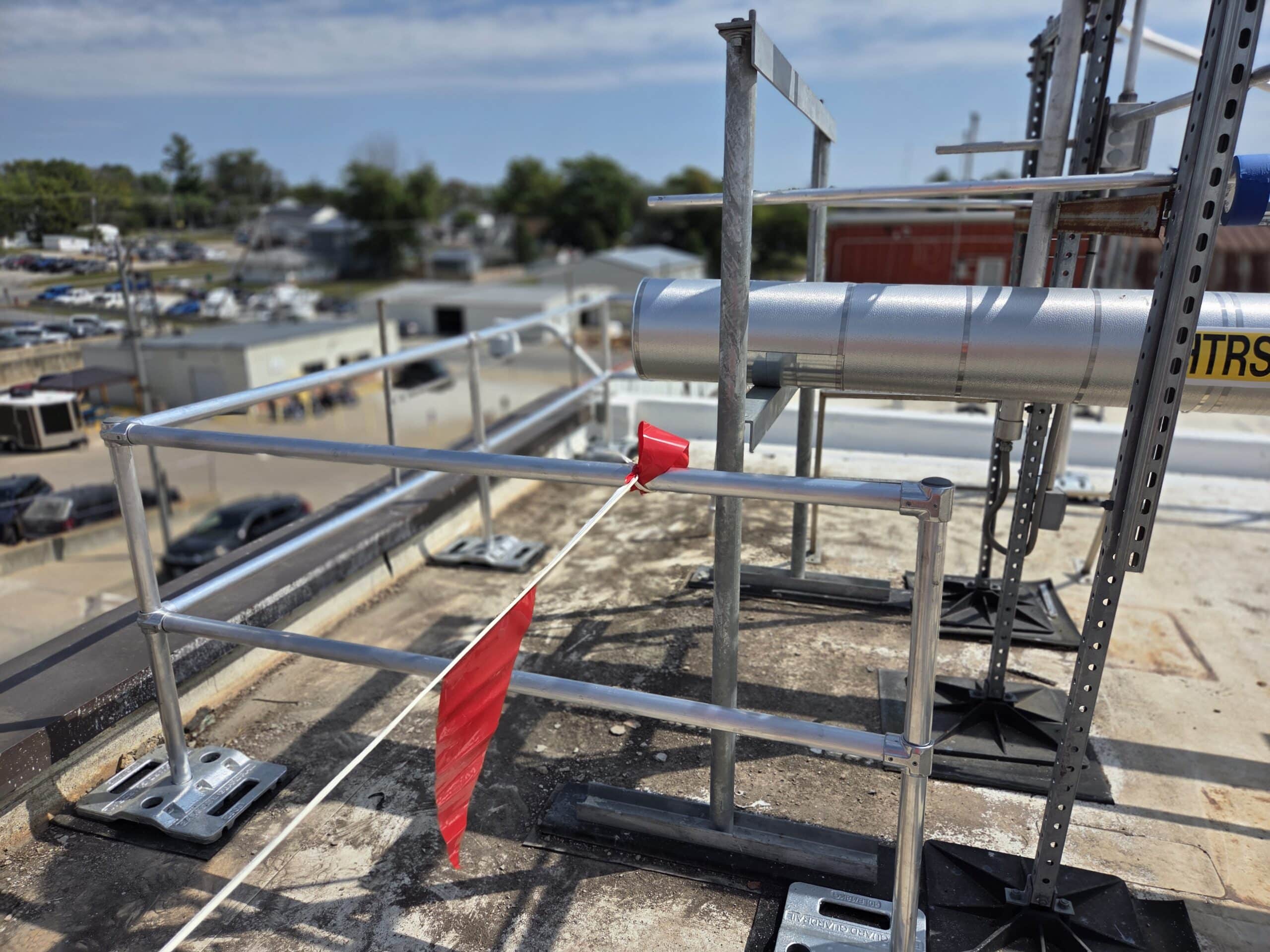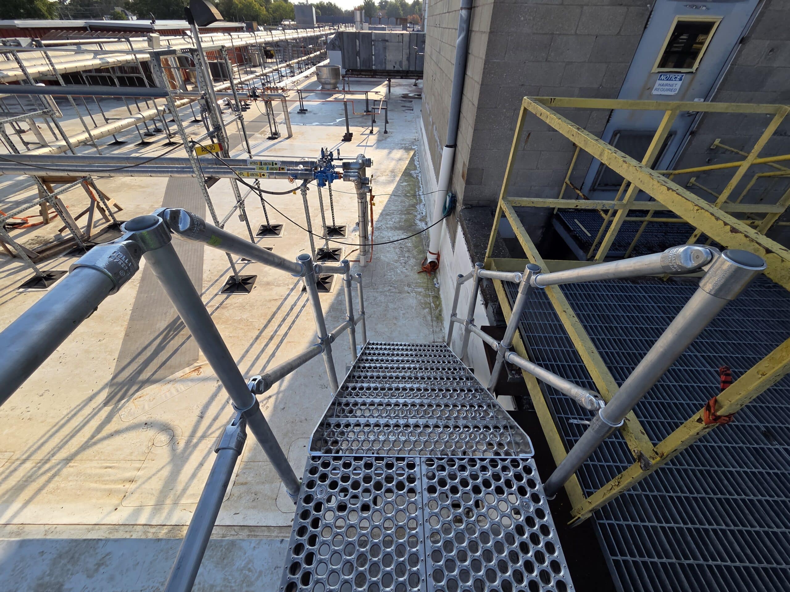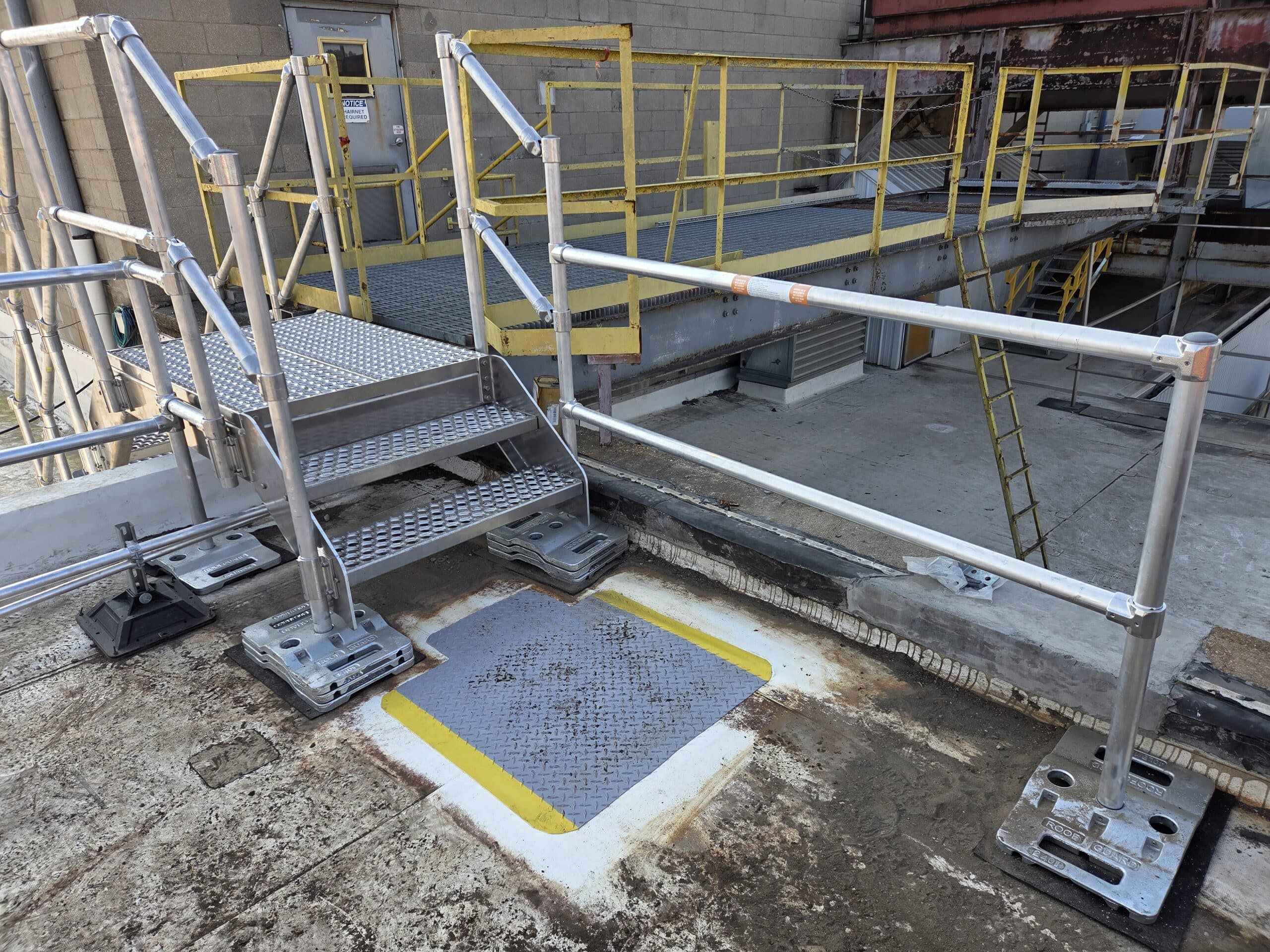 Custom ballasted stairs and guardrails were installed for safe access and fall protection, meeting OSHA and ANSI standards. The modular, lightweight system protects the roof membrane and installs quickly without welding, saving time and costs.