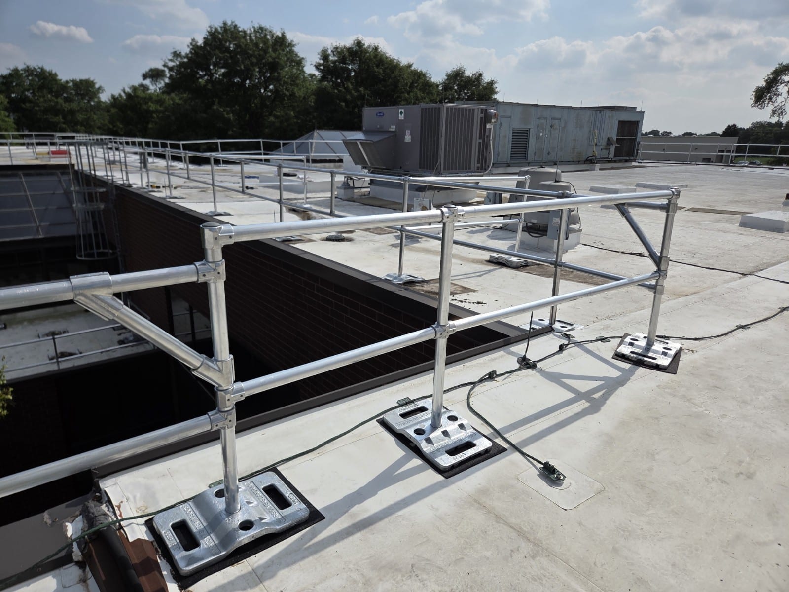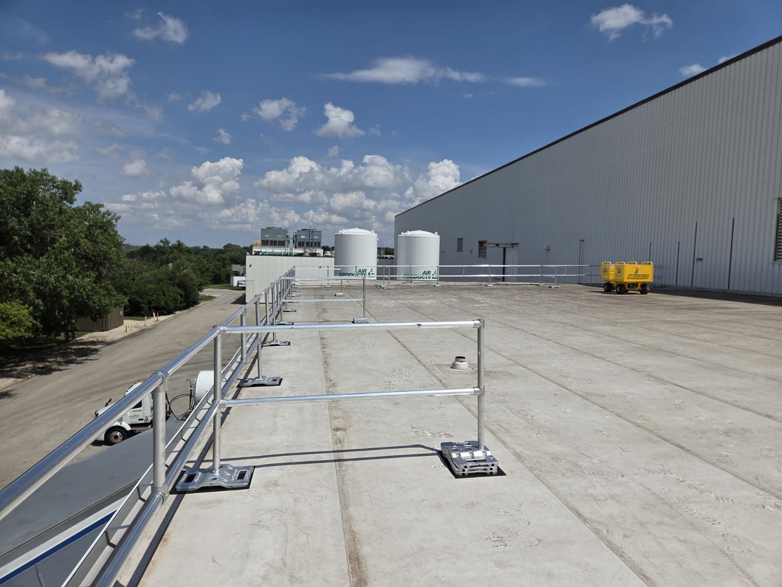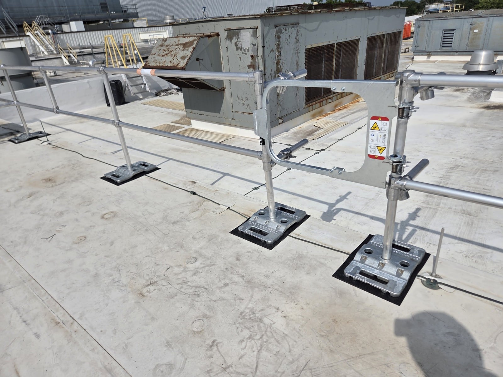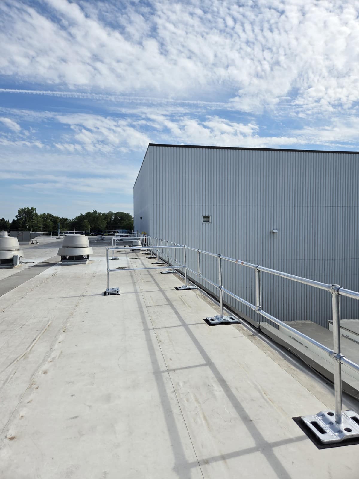Our team engineered a custom rooftop guardrail system designed to fit the unique layout and safety needs of this facility.