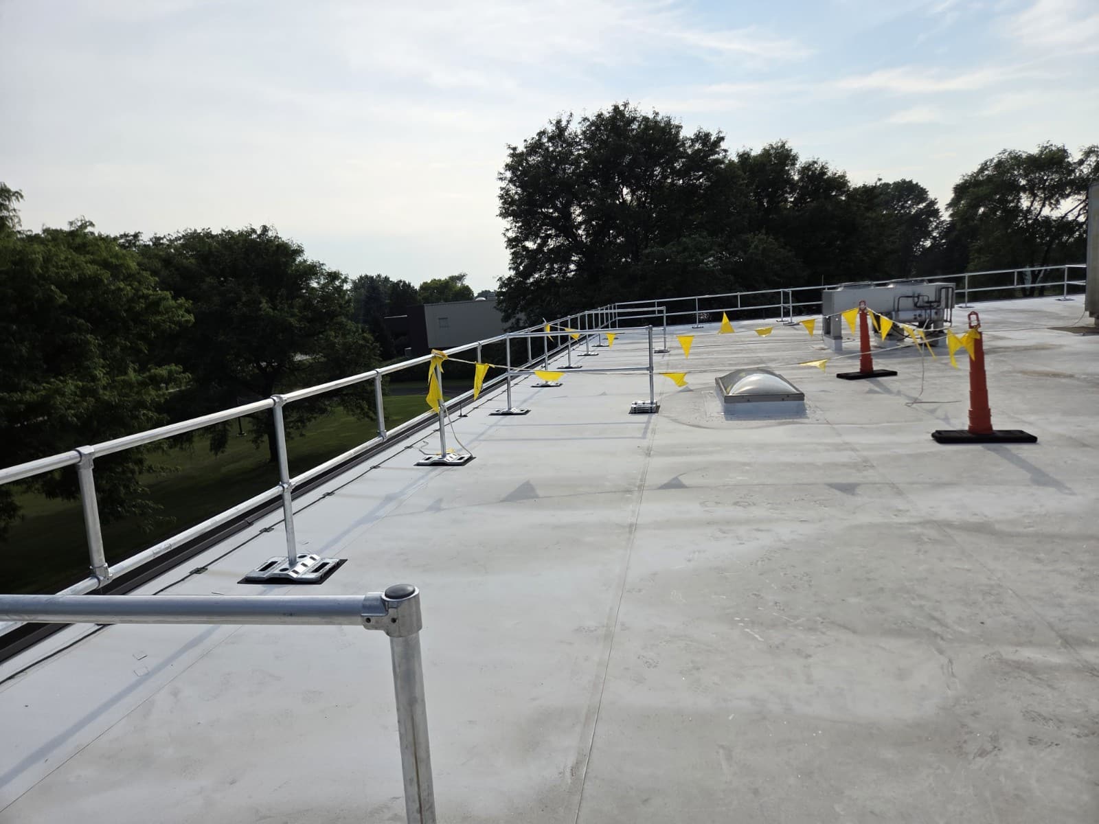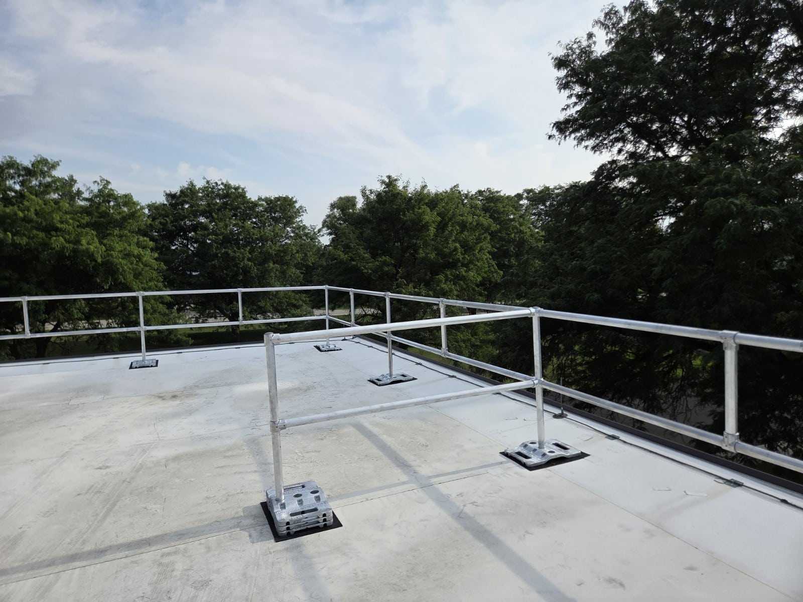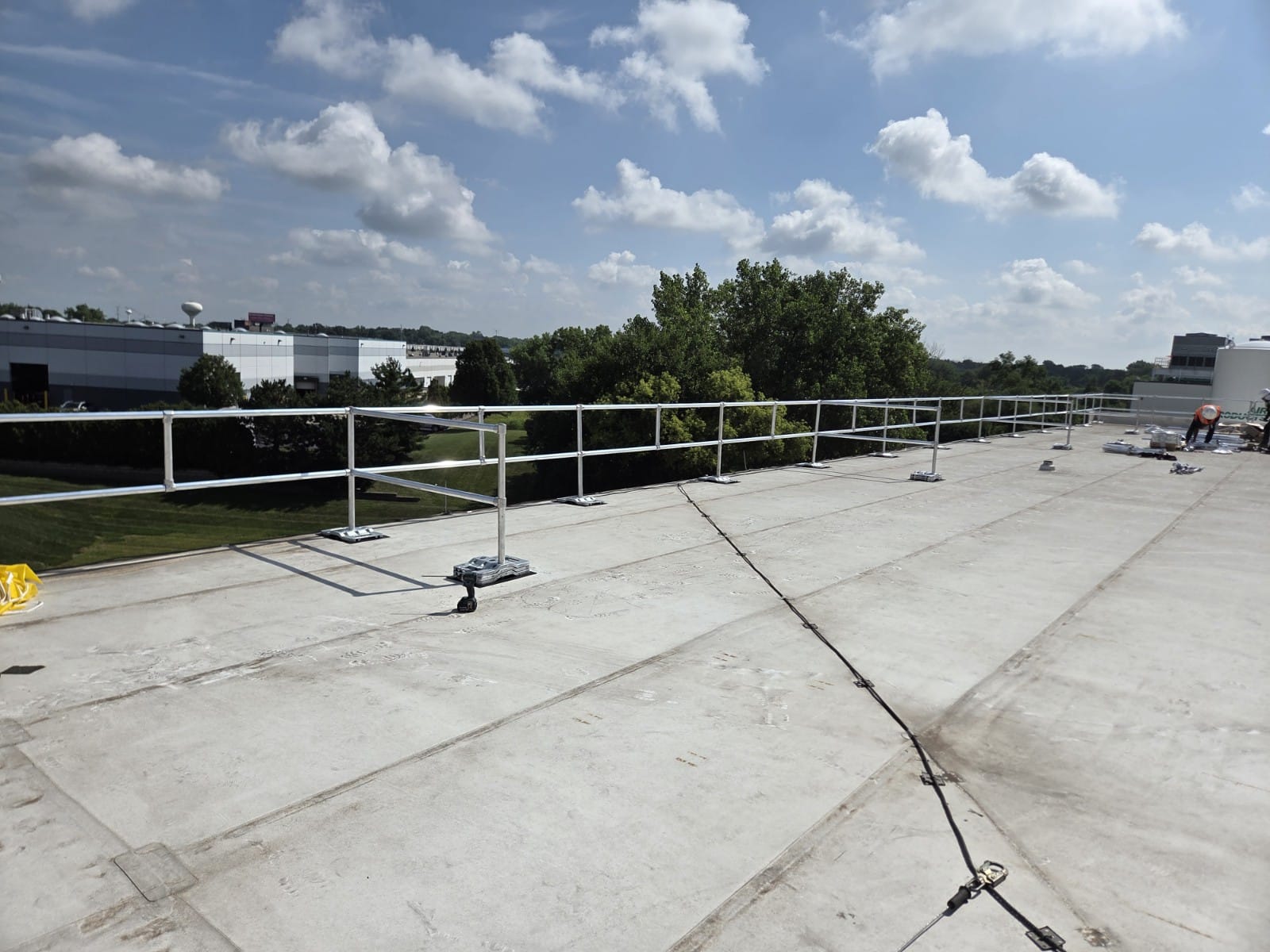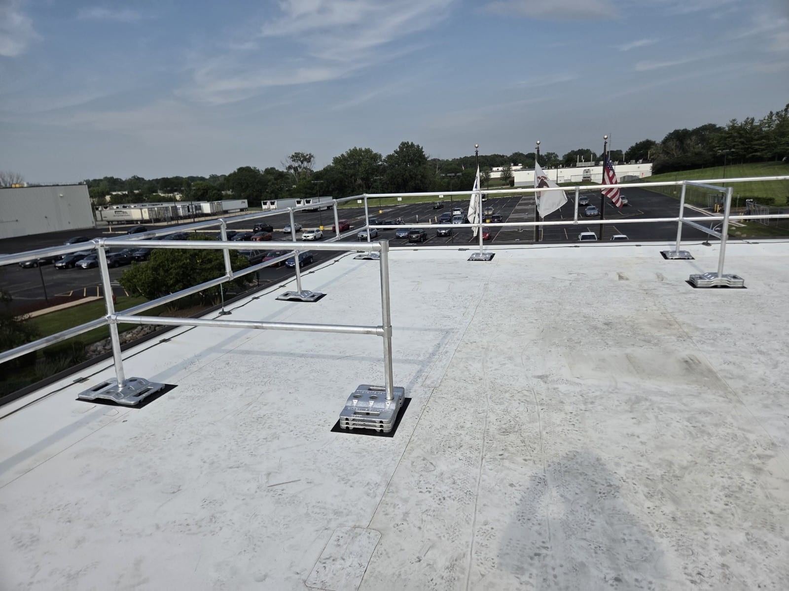 Our team engineered a custom rooftop guardrail system designed to fit the unique layout and safety needs of this facility.
