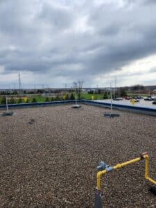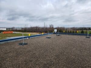 Custom ballasted stairs and guardrails were engineered and supplied for safe access and fall protection, meeting OSHA and ANSI standards. The modular, lightweight system protects the roof membrane and installs quickly without welding, saving time and costs.